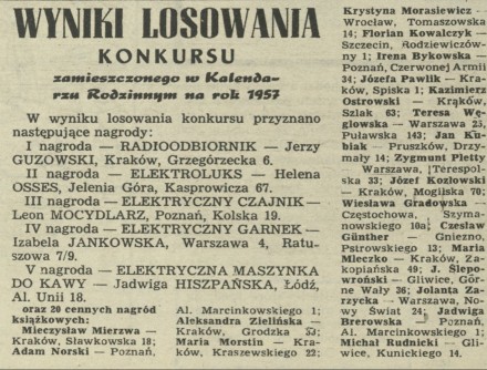 Wyniki losowania konkursu zamieszczonego w Kalendarzu Rodzinnym na rok 1957